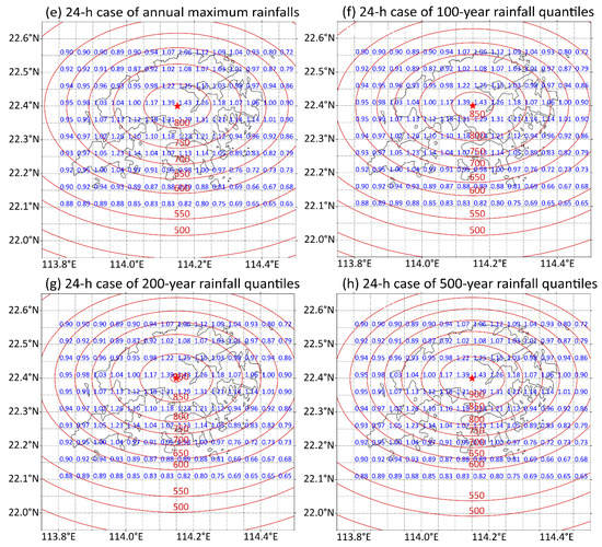 Isohyetal maps of (a–d) 4-h and (e–h) 24-h Hong Kong embryonic PMP estimates for the cases of (a,e) annual maximum rainfalls, (b,f) 100-year rainfall quantiles, (c,g) 200-year rainfall quantiles, and (d,h) 500-year rainfall quantiles.