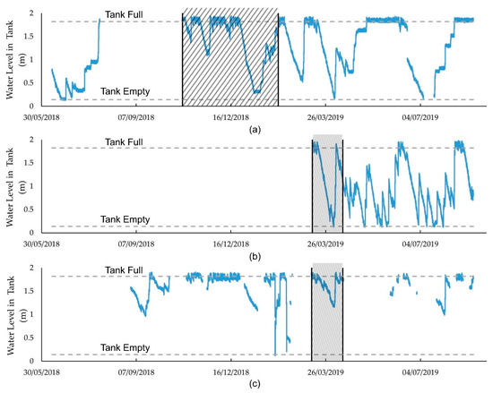 Water level in RWH systems: (a) House A, (b) House B and (c) House C.