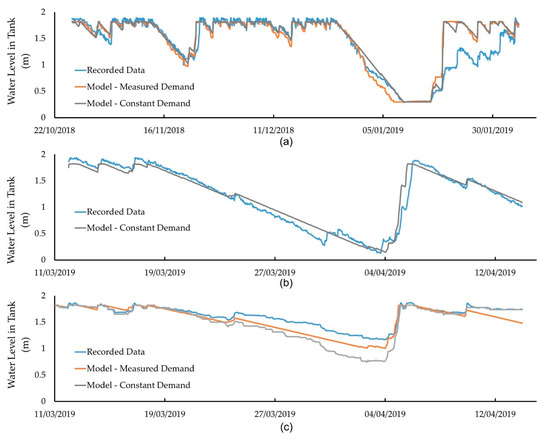 For House A (Figure 3a), the model replicated the recorded data accurately until 18 January 2019, when the model predicted a significantly higher tank level (maximum of 139% higher). This was attributed to discrepancies between the rainfall used as a model input (from a rain gauge located 6.5 km away from site) and rainfall on site or potentially blocked guttering. For House B (Figure 3b), as demand was not monitored, only constant demand was modelled, and the results agreed well with the monitored water level. For House C (Figure 3c), between 24 March 2019 and 4 April 2019, there was a sizable difference between the model and monitored data, once again attributed to non-localized rainfall data. In all cases, the model represents the monitored data well (R2 > 0.78), with no substantial difference between the demand patterns.