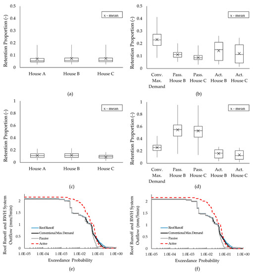 Figure 4 shows the retention and flow duration curve of the different systems for the 30 largest events. For the original demand (Figure 4a), retention during these 30 events was significantly worse than the average values observed in Table 5, with mean values between 0.04 and 0.07. However, House B, which has the highest water demand, still performs the best, with an average value of 0.07. For the suggested improvements (Figure 4b), the maximum demand scenario performed the most favourably, whereas the passive systems exhibited the worst retention. Conversely, when the retention below greenfield runoff is examined, both passive systems perform significantly better than the maximum demand scenario, which in turn still outperforms the active systems. In addition, when the flow duration curves are examined for both House B (Figure 4e) and C (Figure 4f), the active system causes an increase in flow rate above roof runoff due to the release being solely controlled by gravity.