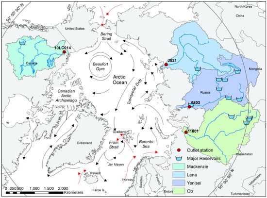 Map showing the Arctic Ocean, oceanic features, major surface currents, major reservoirs, and drainage basins and outlet stations of the Mackenzie, Ob, Yenisei and Lena rivers. Red arrows denote warmer currents, while black arrows denote colder currents. Adapted from Figure 6 in McClelland et al. [].