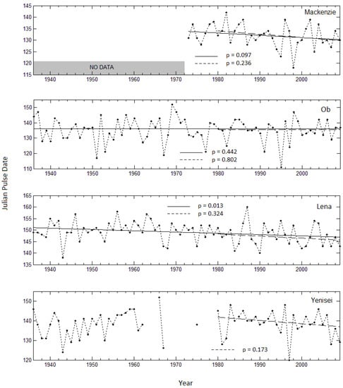 Trends in pulse dates with p-values for 1980–2009 and the entire available length of record. Only 1980–2009 trends are given for the Yenisei station, due to missing data from 1969–1979; Mackenzie station trends are calculated for continuous data from 1973–2009 due to missing data prior to 1973. Black markers denote observed time series values connected with a dotted line, with the thick solid line indicating the longer record trend line and the dashed line indicating the 30-year trend line.