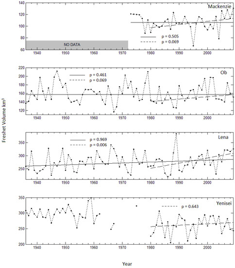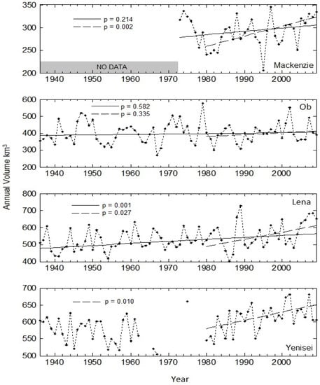 Trends in annual volume with p-values for 1980–2009 and the entire available length of the record. Only 1980–2009 trends are given for the Yenisei station due to missing data from 1969–1979; Mackenzie station trends are calculated for continuous data from 1973–2009 due to missing data prior to 1973. Black markers denote observed time series values connected with a dotted line, with the thick solid line indicating the longer record trend line and the dashed line indicating the 30-year trend line.