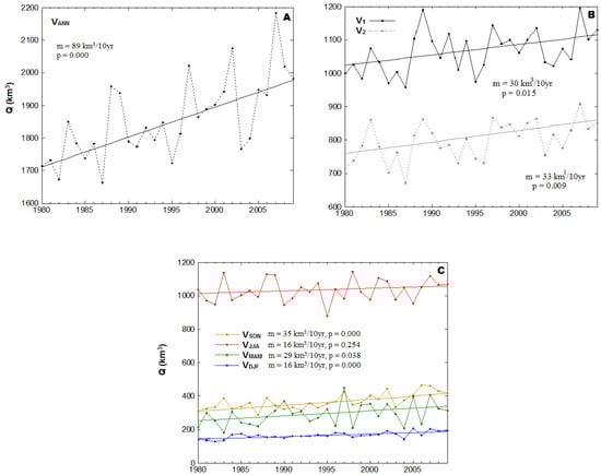 Total annual discharge from all four basins increased significantly by approximately 89 km3/decade over the 1980–2009 period (Figure 5A). To better assess the seasonal contributions to this overall annual increase, trends for all seasonal measures (V1, V2, VDJF, VMAM, VJJA, and VSON) were determined. From Figure 5B,C, it is apparent that, while freshet discharge V2 shows a statistically significant increase of up to 33 km3/decade, other seasons also display increasing discharges over the same period. With the exception of summer (+16 km3/decade, p = 0.254), all increases are statistically significant at the 5% level. Spring, fall and winter show increases of 29 km3/decade, 35 km3/decade and 16 km3/decade, respectively.