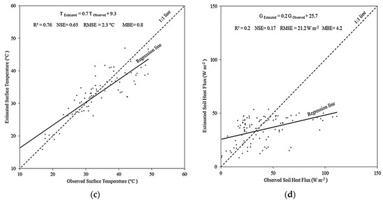 As a result of soil heat flux underestimation, the NSE values were 0.17 and −0.47 for dryland and irrigated lysimeters, respectively, which indicated poor performance for the irrigated field compared to the dryland lysimeter. The RMSE and MBE for the dryland were 55% (21.2 ) and 4.2 respectively; the RMSE and MBE for the irrigated lysimeter were 89.6 and 0.8 , respectively. The dryland regression model accounted for 20% of the variability in measured data with a slope of 0.2 and intercept of 25.7 (Table 2). The irrigated regression model accounted for only 8% of variability, with a slope of 0.3 and intercept of 25.5 (Table 3). The range of satellite-estimated soil heat fluxes is much lower than that with the observed data, indicating METRIC is underestimating soil heat flux, possibly due to the time difference between the physical process of conduction and the instantaneous acquisition of the satellite image. The wet conditions of the irrigated fields may have an impact on the estimation accuracy of Rn and G0 due to the humidity above the soil surface. Accuracy in the estimation of Rn and G0 may be affected by increased humidity near the top of the canopy on the irrigated lysimeter, which may disturb the electromagnetic radiation reflectance compared to the dryland lysimeter. These results agree with [27,31,43].