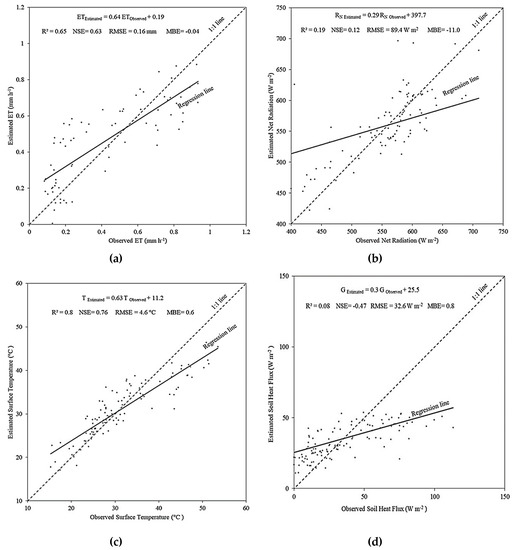 Regression relationship between observed hourly evapotranspiration (a), net radiation (b), surface temperature (c), and soil heat flux (d) from 2001–2010 for NE and SE irrigated lysimeters.