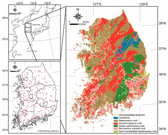 Location of the study area, stations of Groundwater Quality Monitoring Network (GQMN), and hydrogeologic units in Korea.