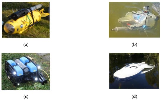 Illustration of multiple underwater drones equipped with cameras, lights, or water quality sensors. (a) Neptune; (b) OpenROV 2.7; (c) BlueROV2; (d) PowerRay.