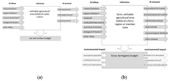 The (gross) farm (gate) budget refers to the farm boundaries and records the nutrients in all products that enter and leave the farm gate. N emissions from stables and manure storages or during the application of organic fertilizers to land are not explicitly accounted for and neither are changes in soil pools and storages. However, all these emissions are part of the nitrogen losses and thus contribute to the total nitrogen surplus in the gross budget (Figure 1b). Farm budgets can also be calculated at larger scales, e.g., at the country level—in that case, the whole farming sector in a country is considered as a single farm [].