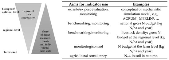 Nitrogen surplus is used as an indicator on different decision levels—at the national, regional, farm and even field levels—as a parameter in legislation, for consulting farmers, benchmarking, and monitoring, but also for taking political decisions and is thus quite a common indicator for land and water managers. Nitrogen surpluses are calculated from individual or standard data. From the field level or the farm level towards higher levels, the degree of data aggregation increases and the share of individual farm data and direct measurements decreases (Figure 3).
