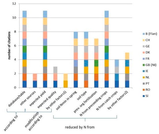 Technical progress may also increase nitrogen efficiency and thus reduce initial nitrogen requirements for the fertilization planning (Figure S1). Split application was quoted by five respondents of this survey, and low-emission application techniques particularly for liquid manure and fermentation residue (drag hose, trailing shoe, strip application and injection) by three respondents as a reason for reduced nitrogen emissions and, consequently, increased plant availability of nitrogen in fertilizers to crops. Precision farming techniques have not yet reached a wider practice level and, therefore, are not referred to in official guidelines for fertilization planning. However, in Denmark, there is a special demonstration scheme on this issue, which may develop into a permanent scheme. The Swiss fertilization guidelines (GRUD) [] address fertilizer application according to “good agricultural practice”, meaning that fertilizer amounts per application are limited to certain thresholds and application should be performed in such a way that losses are minimized. Thus, N availabilities listed in the guidelines indirectly imply low-emission application techniques and/or rapid incorporation of organic fertilizers in order to minimize emissions.