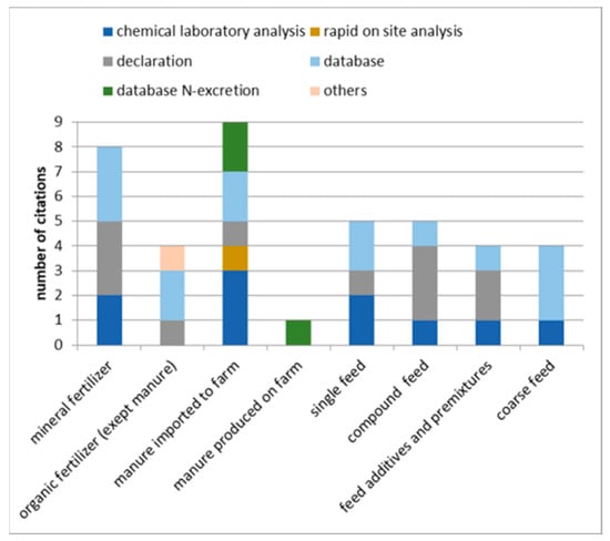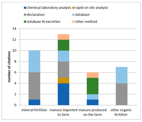 On the inflow side of the farm budget, the chemical composition of mineral fertilizers and traded organic fertilizers (other than manure) is mostly taken from product declarations or databases. For the determination of the nitrogen content in manure imported into the farm, various options are used, including chemical lab analysis and rapid on-farm analysis, declarations and databases on nitrogen concentration in manure and on nitrogen excretion of farm animals. Manure produced on the own farm is analyzed less frequently. Instead, in this case, databases are used to determine nitrogen concentration (Figure 5).