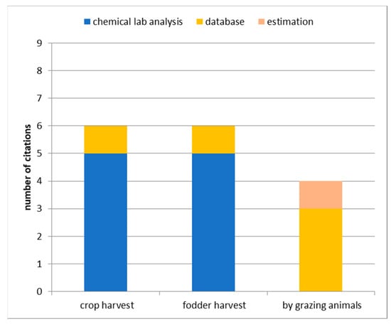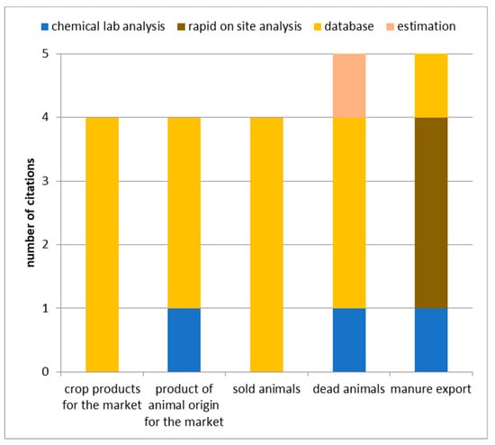 Concerning nitrogen removal from the farm, data on the nitrogen concentration of the harvested crops mostly derive from databases or tables (Figure 8), in contrast to the reports on soil surface budgets (Figure 6). Nitrogen removal by farm animals, sold or dead, leaving the farm is usually taken from databases. As an exemption, manure to be exported from the farm is also analyzed using rapid on-site analysis, e.g., near-infrared spectroscopy (NIRS) technology. So, in the Netherlands and Flanders, manure that is transported between farms has to be weighed and analyzed for N and P. Data of this origin are found in [].