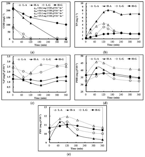 (a) COD; (b) total phosphorus (TP); (c) P%; (d) poly-b-hydroxybutyrate (PHB); and (e) poly-b-hydroxyvalerate (PHV) in 360 min. (L-A: low concentration acetic acid, H-A: high concentration acetic acid, L-G: low concentration glucose, H-G: high concentration glucose).