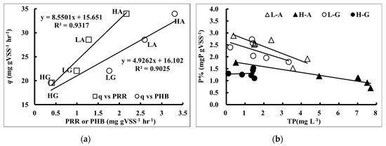 It was also noticeable that intracellular phosphorous content (P%) and phosphate concentration in bulk solution (TP) showed a highly negative correlation when acetic acid was used as a carbon source. The correlation was not as nearly as high when glucose was the carbon source (Figure 2b,c and Figure 3b). This revealed that in acetic acid, the activated sludge released phosphate by degrading the long-chain polyphosphate under anaerobic conditions, resulting in the reduction of intracellular polyphosphate content. Besides, the intracellular PHAs were oxidized to obtain the energy for phosphate uptake under aerobic conditions to enrich intracellular phosphorous content. On the contrary, when high concentration glucose was used as a carbon source, the anaerobic intracellular phosphorous content decreased and the rate was 0.02 mgP g VSS−1 h−1, with the phosphate release rate of 0.39 mgP g VSS−1 h−1. It was also observed that the aerobic intracellular phosphorous increase rate was found to be 0.04 mgP g VSS−1 h−1, with a phosphate uptake rate of −0.01 mgP g VSS−1 h−1. It was observed that the phosphate release rate did not reflect the phosphate content in the bulk solution. This might be due to the adsorption of phosphate onto extracellular polymeric substances (EPS).