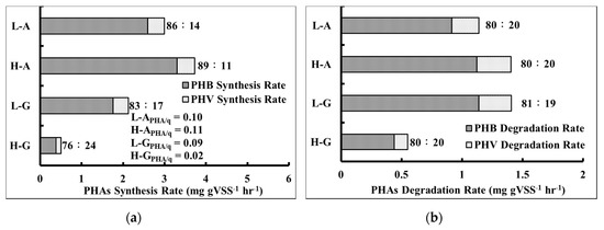 Map of variations in PHA composition. (L-A: low concentration acetic acid, H-A: high concentration acetic acid, L-G: low concentration glucose, H-G: high concentration glucose). (a) PHAs Synthesis Rate; (b) PHAs Degradation Rate