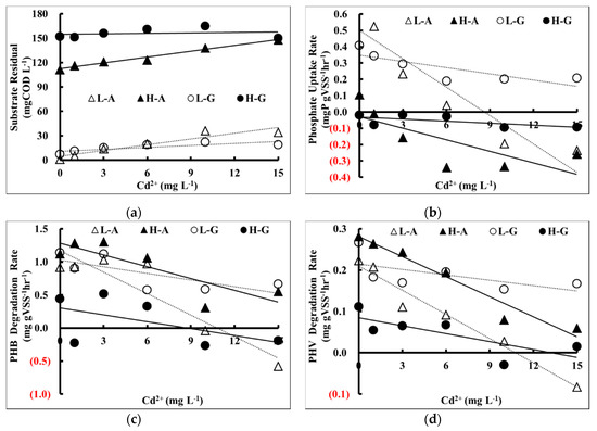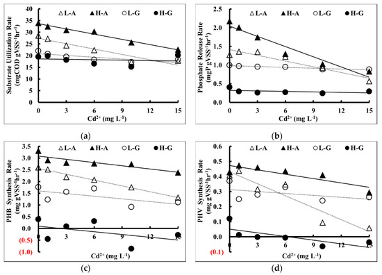 It was observed that the PHB synthesis rate of the acetic acid trials was more suppressed by the increase of Cd2+ concentration than that of the glucose trials as shown in Figure 5c. The inhibition was more apparent for low concentration of acetic acid trials (slope = −0.08) and also the PHB degradation of the acetic acid trials was more suppressed by the increase of Cd2+ concentration than that of the glucose trials as shown in Figure 6c. Again, the inhibition was more apparent in the low concentration of acetic acid trials (slope = −0.11).