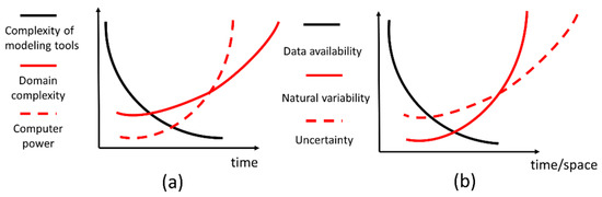 Two paradigms are identified by Simonovic [1] as shaping contemporary water resources management: “The first paradigm focuses on the complexity of the water resources management domain (increases with time), and the complexity of the modeling tools (decreases with time), in an environment characterized by continuous, rapid technological development (sharp increase in development over time). The illustrative presentation of the complexity paradigm is shown in Figure 1a. The extension of temporal and spatial scales characterizing contemporary water resources management problems leads to an increase in the complexity of decision-making processes (which could be measured using a number of state variables on the vertical axis in Figure 1a). The evolution of systems analysis with increasing computational power (expressed for example using computational time required for the solution of a problem on the vertical axis in Figure 1a) results in more complex analytical tools being replaced by simpler and more robust search tools and very often by simple simulation (assessed using a number of mathematical relationships on the vertical axis in Figure 1a).