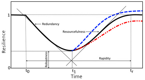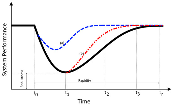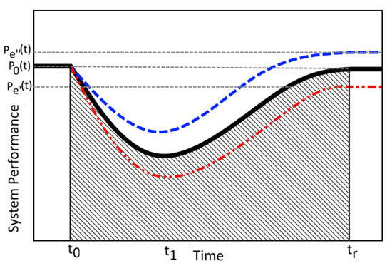Change of system performance forms the basis for quantification of system resilience. The transformation of system performance into system resilience is captured in Figure 4. Illustration in Figure 4 is not related to the simple example from Figure 3. Notation in Figure 4 includes: t0—time of the the beginning of the disturbance; t1—time of the end of system disturbance; tr—time of the end of the recovery period; —system performance; —initial system performance level; —degraded ending system performance level; —improved ending system performance level; the area between and performance line (full black line) represents the loss of system performance; and the shaded area under the performance line denotes the system resilience.