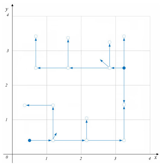 The network example system includes 16 (4 × 4) cells shown in Figure 6. To simplify the network model simulation, one node is assumed to exist in every cell, as shown in Figure 6. Blue color filled nodes are representing main components of the water supply network, such as intakes, treatment plants, etc. Blue color empty nodes represent storage facilities such as pump stations, reservoirs, etc. The edges are used for representation of water transmission pipes and conduits. The example network includes 16 main components, storage facilities and pump stations, and 17 water transmission pipes and conduits.