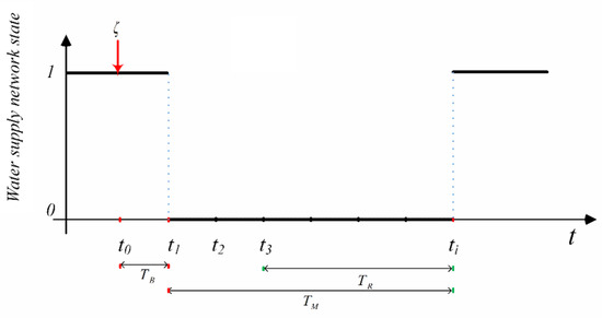 In the second step performance criteria is selected as a simple state of the water supply network. To simplify the simulation, the network is considered to be in one of two states: function and malfunction—denoted with the value of 1 or 0 as shown in Figure 7.