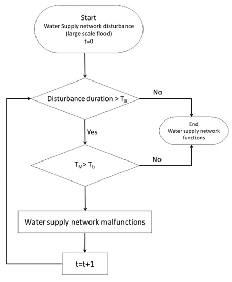 Following the performance-based engineering process (see Figure 2) the first step is the identification of disturbance. It is assumed that (i) flood occurs once, (ii) affects a large area, and (iii) lasts over a longer time. Many water supply network elements located in the floodplains are affected, due to submergence. In this example, water supply network elements located in the four bottom and four right cells (see Figure 6), with coordinates {0 ≤ x ≤ 4, 0 ≤ y ≤ 1} ꓴ {3 ≤ x ≤ 4, 1 ≤ y ≤ 4}, are assumed to be affected. The selected flood could be a historical event or any statistical flood event. The whole process can be repeated for as many disturbance events as the user would like to investigate.