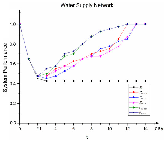 Simulation results, presented in Figure 9, clearly show the difference in system performance as a function of the response strategy. The black line (P0) in Figure 9 shows system performance without any response. The other five lines are describing system performance according to the selected five response strategies (see the Figure 9 legend). Water supply network performance under RS-OD and RS-HD outperforms performance under other response strategies, and RS-FL and RS-IE result in the worst performance. Simulation results under all five strategies confirm that in this example case, the water supply system cannot exceed the initial performance level after the flood. The possible explanation for these results is that no water supply network system improvements can be built in a short period of time. Therefore, the additional resilience characteristic of rapidity and the end of recovery time are determined as the time when the system performance recovers to the preflood performance level.