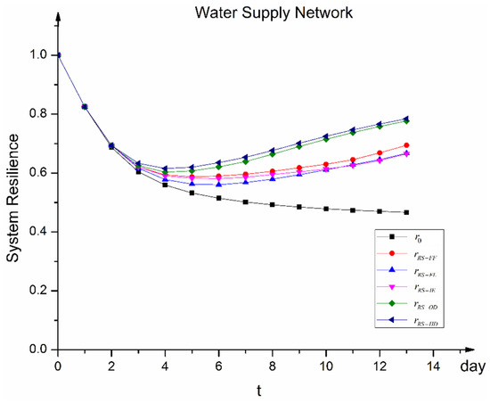 The resilience of the example water supply network under various response options is calculated using a modified Equation (2), adjusted for the network systems [22].