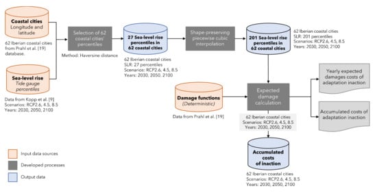 The methodological approach followed in this study to assess the costs due to sea-level rise if adaptation is not implemented is summarised in Figure 1. The first step is to identify the cities for our assessment. A recent study estimated the economic damage due to coastal flood height for 600 European cities, as well as the adaptation costs, obtained as a function of defence height [19]. This is done in a deterministic way. Of all these cities, we focus on those located in the Iberian Peninsula, our target study zone. Our sample includes 62 main coastal cities in Portugal and Spain, as shown in Figure 2. The second step is estimating future sea-level rise in each city using a stochastic method and considering three scenarios (RCP 2.6, 4.5 and 8.5) as described next in Section 3.1.1. The third step is calculating, also with a stochastic approach, the annual and accumulated expected damage due to sea-level rise in each of our 62 cities. This is explained in Section 3.1.2.