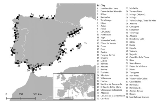 Selected 62 Iberian coastal cities in Spain and Portugal. Source: own elaboration.