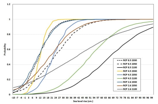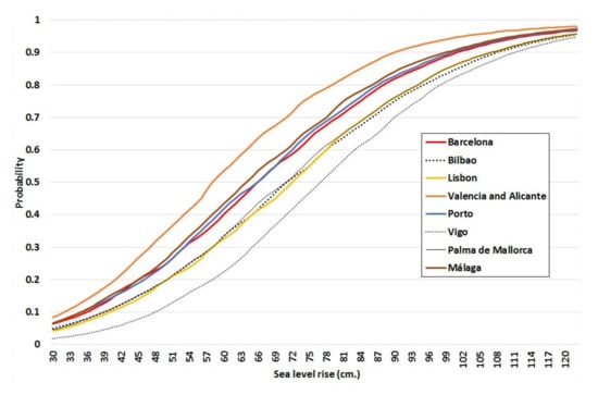 As an illustration, Figure 3 shows a standard cumulative distribution function for sea-level rise for nine representative Iberian coastal cities in the year 2100 considering the highest emission scenario, RCP 8.5. The ten cities were selected for being those with the largest population based on data from Eurostat (European Commission, Brussels, Belgium).