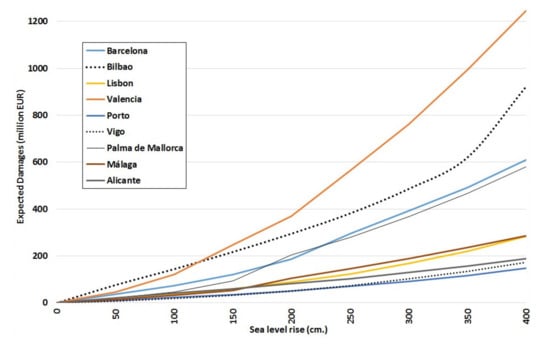 Note that Bilbao, Valencia and Barcelona are the coastal cities with the largest expected accumulated damage in the case of inaction. Both the sea-level rise percentiles and the damage grow rapidly over time, particularly in the second part of the century, in line with studies for other cities worldwide [49]. An illustration of accumulated expected damage for four cities in the top ranking of damage is shown in Figure 7.