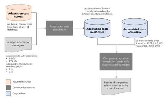 Summary of the methodological approach followed to estimate adaptation investment needs in each city under three sea-level rise scenarios. Investment costs are then compared to the accumulated costs of inaction to assess adaptation benefits.