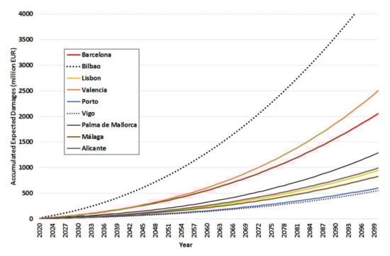Accumulated expected damage in nine Iberian coastal cities with largest population under RCP 8.5.