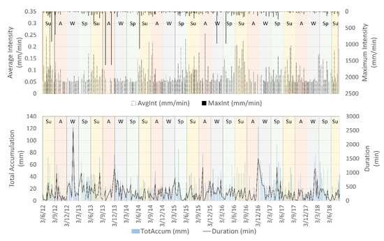 The study area experienced year-round precipitation, however, most of the accumulation was in winter (frontal systems) and summer (convectional storms) (Figure 2). September and October were the driest months, most notably in 2012, 2013, and 2016. The most intense rains occurred in summer months, for example, see high values for Average Intensity (AvgInt) in the summer of 2012, 2014, 2016, 2017, 2018, and to a lesser degree 2013 and 2015. One may also notice that when Total Accumulation (TotAccum) was high and Duration was low, Maximum Intensity (MaxInt) was also high because it follows that higher intensity rainfall occurred when high rainfall totals were received in a short time-period.