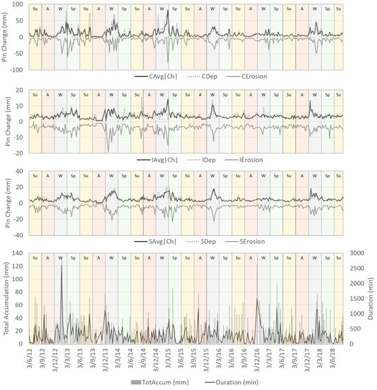 Seasonally, erosion variables show the most variability during winter months (Figure 3). Winter of 2016–2017 experienced less erosion than other years for all geomorphic areas, however, the study area received high rainfall accumulation during two weekly measurement periods.