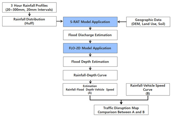 The transportation network enables movement of people and goods and is the basis of economic activity. Recently, short-term locally heavy rains occur frequently in urban areas, causing serious obstacles to road flooding and increasing economic and social effects. Therefore, in advanced weather countries, many studies have been conducted on realistic and reliable impact forecasting by analyzing socioeconomic impacts, not just information transmission as weather forecasts. In this paper, we use the Spatial Runoff Assessment Tool (S-RAT) and Flood Inundation model (FLO-2D model) to calculate the flooding level in urban areas caused by rainfall and use the flooding rate. In addition, the rainfall–flood depth curve and the Flood–Vehicle Speed curve were presented during the analysis, and the traffic disruption map was prepared using this. The results of this study were compared with previous studies and verified by rainfall events in 2011. As a result of the verification, the result was similar to the actual flooding, and when the same rainfall occurred within the range of the target area, it was confirmed that there were sections that could not be passed and sections that could be passed smoothly. Therefore, the results suggested in this study will be helpful for the driver’s route selection by using the urban flood damage analysis and vehicle driving speed analysis.