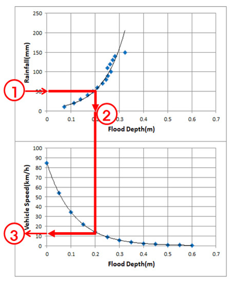 On the other hand, using the rainfall–depth–vehicle speed relations, the reduced rates of vehicle travel speed were identified owing to computation of flood depths for the cells during the hours of traffic control, and cells capable of smooth traffic despite traffic control were detected. It is judged that this method will help drivers reach their destinations by avoiding roads with high reduction rates of speed.