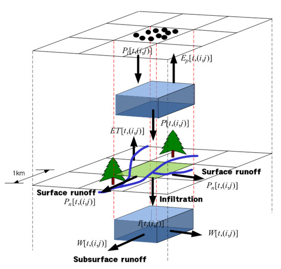 Figure 3 shows the conceptual diagram of cell water budget for the model. Discharge is calculated by inserting rainfall obtained from the above equation into S-RAT, a distributed runoff model.