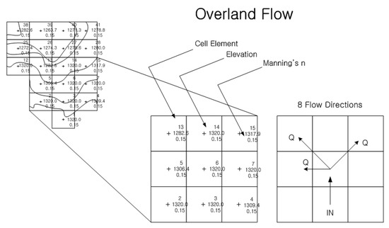 The runoff analysis was conducted using the S-RAT model, which is a distributed rainfall–runoff model capable of cell unit analysis and has the advantage of precisely deriving the running time and leakage value because of its comprehensible interface. This model developed in Korea is now used in the research projects of the Korea Meteorological Administration [35].