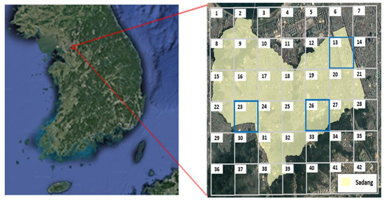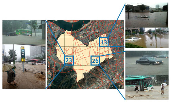 Seoul, Korea’s capital, was selected as the target area for this study. Among Seoul’s districts, the areas of Sadang-dong, Bangbae-dong, and Seocho-dong, which were affected by torrential rainfalls of approximately 300 mm from 1:00 to 23:00 on 27 July 2011, were divided into cells of 1 × 1 km for analysis. Figure 5 shows a picture of the target area divided into cells, and the analysis was conducted only for cells in Sadang-dong. On the other hand, Figure 6 is composed of a cell and inundation photographs of the actual damage on 27 July 2011, referring to the news, SNS, and past studies [49] at that time. Although many floods occurred, there was a limit in finding and verifying accurate literature regarding these events.