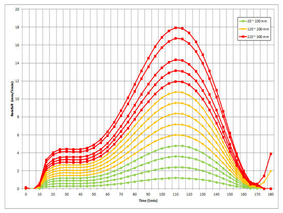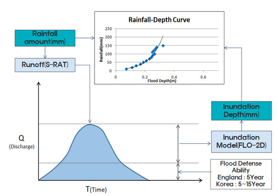 The conceptual diagram of the rainfall–depth curve is shown in Figure 12. Rainfall of 20–300 mm was used with Huff’s 3rd-quartile technique in the rainfall–runoff model, and discharge data according to rainfall were calculated by increasing rainfall at intervals of 20 mm. From the estimated flow rate, the flood depth data considering the flood protection capacity (5–15 years) is used as the input data for the flooding model. For a detailed analysis of the rainfall–depth curve that causes certain regional inundation, see Reference [35].