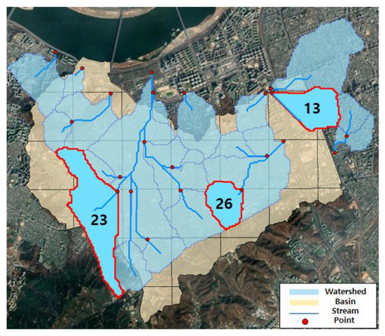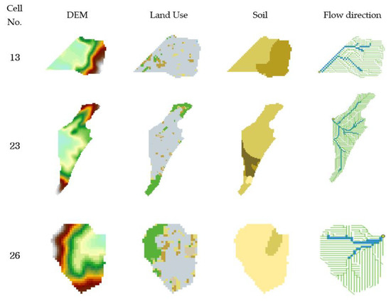 Figure 9 is the result of the Huff third-percentile rainfall distribution for 3 h, and Figure 10 is the construction data for DEM, land use, and soil map, which are input into the S-RAT model. The resolution of GIS topographic data used in this analysis was 30 × 30 m. For Figure 11, the result of dividing the watershed by the minimum elevation of each cell at Sadang Station exit is shown, with cells 13, 23, and 26 in red, indicating flood damage. The discharge computed here is the inland inflow rate of the flood inundation model and is used as the input value of flood analysis.