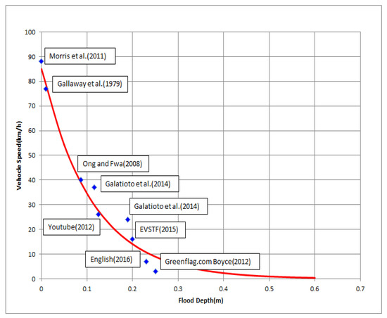 In addition, in the previous study, vehicles of different sizes (small, large, and four-wheel drive) were classified, but the curves presented in this study refer to the average of each vehicle type. Moreover, most drivers are considered to drive above the speed limit at low flood depths. The regression equation was calculated by adjusting the speed up from the lowest value (Figure 13; Equation (8)).