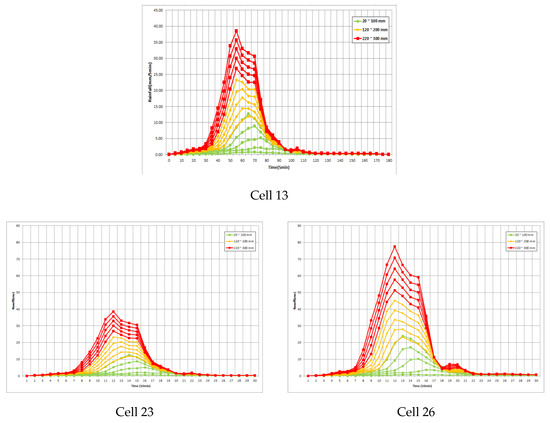 The input data were applied to the flood model, and the results were obtained. Discharge computed at the lowest altitude point for cells 13, 23, and 26, the targets of analysis, is shown in Figure 14. Meanwhile, Figure 15 shows the results of computing the flood depth of the affected area based on the discharge of S-RAT using FLO-2D. In Figure 15, cell 13 showed a high flood depth, and the rainfall–depth curve was created based on the calculated depth of flooding.