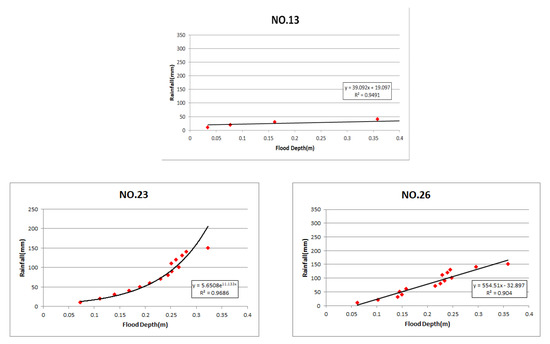 In the rainfall–depth curve computation, the Sadang-dong area was divided into 1 × 1 km cells, and then, each was given a cell number and analyzed. This study intended to conduct an analysis in relation to vehicles, using a 20-cm exhaust port height for passenger cars and 1/2 of the tire height for trucks [30]. Table 2 shows the computed threshold rainfall of each cell at a flood depth of 20 cm applicable to the vehicle. Meanwhile, Figure 16 shows the rainfall–depth curve pertaining to cells 13, 23, and 26, where flooding actually occurred.
