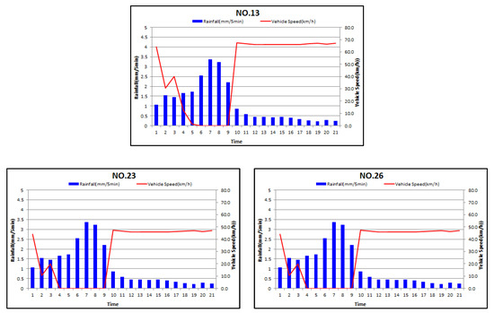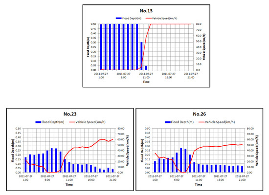 Figure 17 shows the rainfall–depth–vehicle speed relations. On 27 July 2011, traffic control was implemented at 6:30 a.m. and lifted at 10:00 a.m. Analysis of the rainfall–depth–vehicle speed relation showed that vehicles could not pass the area at the time of damage.