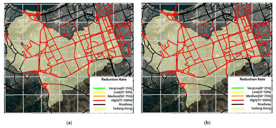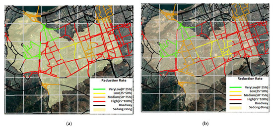 Figure 19 shows the change of vehicle speed according to hourly rainfall of cell 23. The time marked in red represents the hours of 06:00–13:00, when vehicle control was carried out on 27 July 2011. Based on this, the reduction rate grades were divided into four levels for the Sadang-dong area: very low, low, medium, and high. The division criteria into four levels was calculated following the reduction rate according to the speed limit for each cell, with very low at 0%–25%, low at 25%–50%, medium at 50%–75%, and high at 75%–100% (Figure 20 and Figure 21). Figure 20a,b and Figure 21a,b are pictures of 07:00 and 09:00 at the time of control.