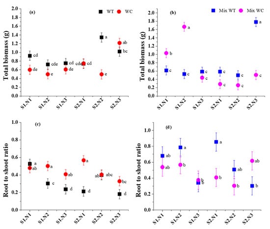 Total biomass and root-to-shoot ratio of Wedelia trilobata (WT) and Wedelia chinensis (WC) under mono and mixed culture with six replicates, (a) total biomass of both species under monoculture, (b) total biomass of both species under mixed culture, (c) root-to-shoot ratio of both species under monoculture, (d) root to shoot ratio of both species under mixed culture. Different letters indicate the significant difference between different treatments of submergence and nutrient concentrations according to ANOVA and Student–Newman–Keuls, p < 0.05.
