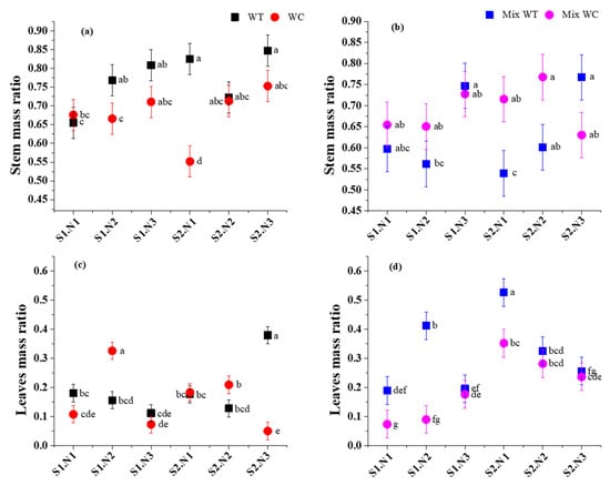 S, N, C and their interaction, S × N × C, had significant effects on leaves mass ratio (Table 1, p < 0.01). The leaves mass ratio of WC was higher at both submergence and low nutrient concentration levels (S1.N2 and S2.N2) but lower at higher nutrient concentration along with both submergence levels (S1.N3 and S2.N3). This was because increasing nutrients and submergence reduced the leaves mass ratio of WC, but opposite results were found under the same treatment for WT in monoculture (Figure 3c). Under competition, WT had a higher leaves mass ratio in all treatments of submergence and nutrients compared to WC (Figure 3d). According to these results, mass allocation of WT was higher than WC in higher submergence and higher nutrients levels.